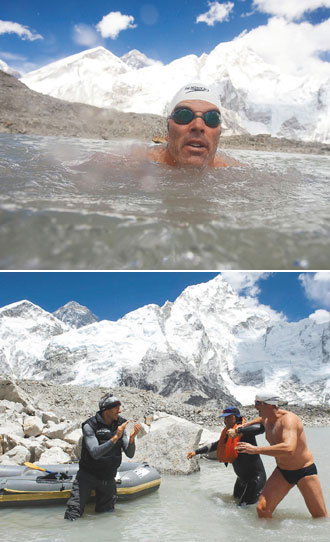 據(jù)報道,現(xiàn)年40歲的普伊曾在冰冷的南極海中長泳,還曾泳渡北極海,其超人的耐寒能力為其博得“北極熊人”的稱號。22日,他僅穿戴泳褲、蛙鏡和泳帽,跳入約攝氏2度的珠峰普摩力湖內(nèi)開始游泳。