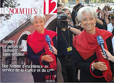 在原始版本中,拉加德身后不是高架橋,而是一群競(jìng)相對(duì)她進(jìn)行拍照和采訪的記者,更為重要的是,她身上還佩戴著昂貴的手鏈、戒指和耳墜等珠寶飾品。令人尤其難以理解的是,刊登上述封面照的雜志主編卡利發(fā)在接受相關(guān)采訪時(shí)居然前后給出了兩種截然不同的解釋。