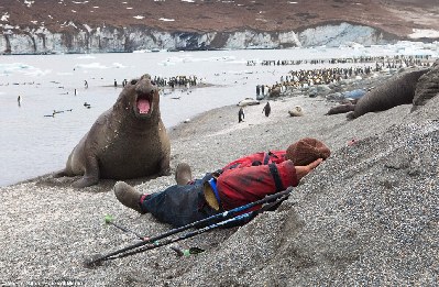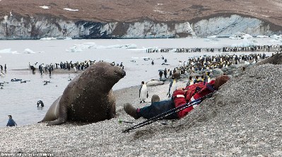 據(jù)英國《每日郵報》2月11日報道,一個由6人組成的野生動物攝影團隊在靠近南極洲的南喬治亞島探險時,拍下了許多珍貴的照片,其中包括一名攝影師在打盹時遭遇4噸重雄性象海豹的情景。