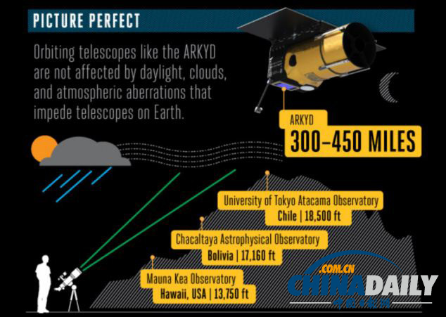 ARKYD望遠(yuǎn)鏡將會(huì)運(yùn)行在距離地球480-720千米的外太空,運(yùn)行速度為每秒8千米。