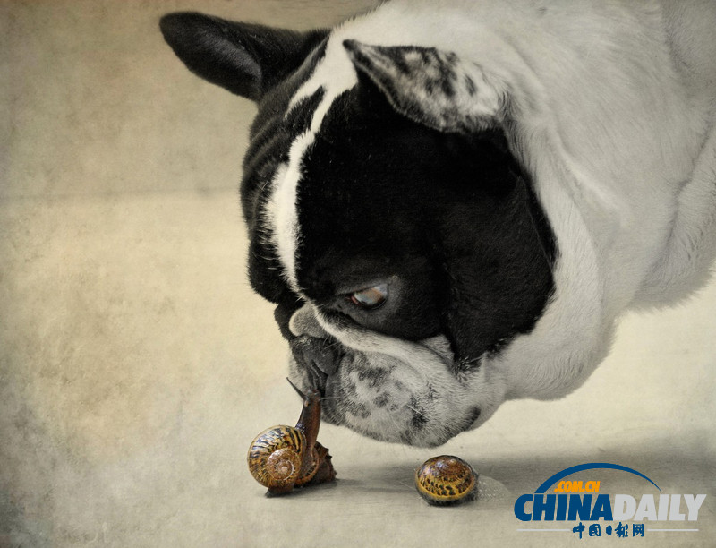當(dāng)?shù)貢r間2013年8月12日報道,西班牙納隆,一只法國斗牛犬和一只小蝸牛擦肩而過,