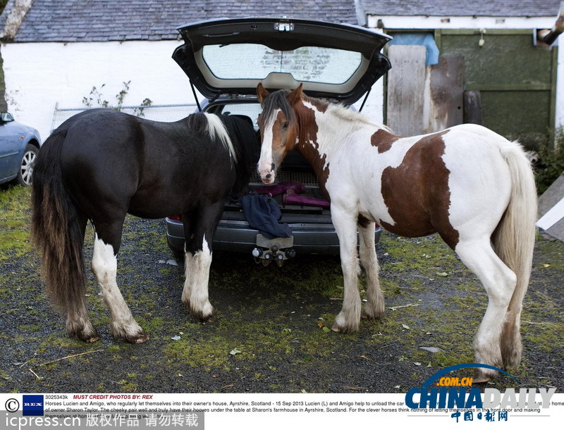 當(dāng)?shù)貢r間2013年9月15日報道,蘇格蘭額爾郡,Sharon Taylor和她的3個兒子都很喜歡馬,經(jīng)常讓兩匹可愛的小馬Lucien和Amigo進房間,和她生活在一起,和她養(yǎng)的貓狗一起玩耍,就算點心被吃掉也無所謂。Sharon和她的家人還為Lucien和Amigo拍攝影片,上傳至它們自己的facebook主頁上。據(jù)Sharon表示,雖然Lucien和Amigo現(xiàn)在還不會爬樓梯,但在樓上臥室內(nèi)看到他倆的身影是遲早的事情。