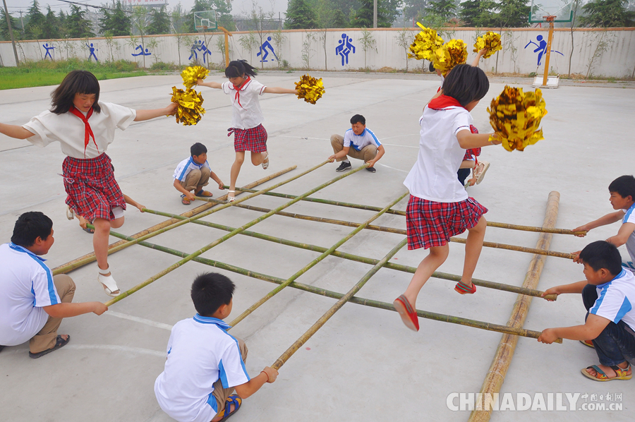 2015年6月9日,江蘇省連云港市贛榆區(qū)青口鎮(zhèn)申城小學在跳起“竹竿舞”,這類文體項目陸續(xù)引進校園,讓學生樂享健身。 張正友/中國日報亞洲新聞圖片網(wǎng)