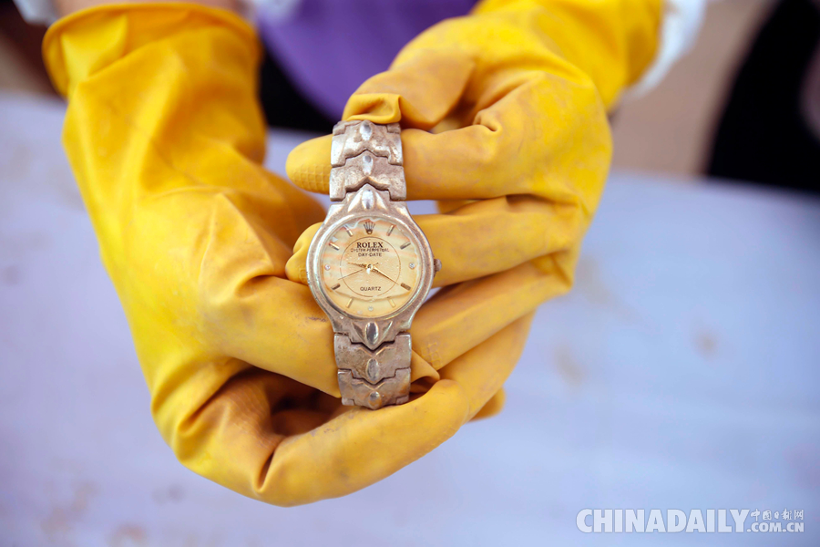 2015年6月11日,湖北監(jiān)利殯儀館,“東方之星”客輪上清理出來的323件物品已完成身份核對。圖為遇難者乘客的手表。 陳卓/中國日報亞洲新聞圖片網(wǎng)