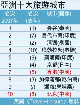 泰國(guó)曼谷同時(shí)成為亞洲最佳旅游城市,第2及第3位分別是印度烏代布爾,日本京都列第6位,國(guó)際大都會(huì)香港排名第7,北京亦占第10位。