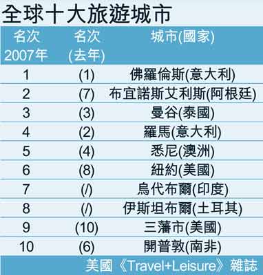 中國(guó)日?qǐng)?bào)網(wǎng)環(huán)球在線消息:美國(guó)《Travel+Leisure》旅游雜志昨天公布“2007年全球十大最佳城市”及“全球百大最佳酒店”排行榜,意大利佛羅倫斯今年蟬聯(lián)最佳旅游城市首位,香港及北京仍受各地旅客愛戴,兩地分列亞洲區(qū)最佳旅游城市的第7位及第10位。