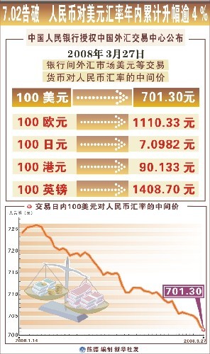 2008年以來,人民幣對美元匯率中間價已先后28次改寫新高紀錄,年內(nèi)累計升至幅度超過4.1%。