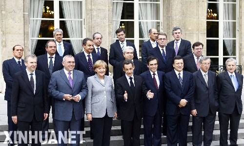 10月12日,在法國(guó)首都巴黎,歐盟輪值主席國(guó)法國(guó)總統(tǒng)薩科齊(前排左四)等歐元區(qū)領(lǐng)導(dǎo)人在峰會(huì)開(kāi)始前合影。歐元區(qū)15國(guó)首腦12日在巴黎召開(kāi)歐元區(qū)有史以來(lái)的首次峰會(huì)。會(huì)議通過(guò)了一項(xiàng)行動(dòng)計(jì)劃,同意由各國(guó)政府為銀行再融資提供擔(dān)保并向銀行注資,以共同應(yīng)對(duì)當(dāng)前的金融危機(jī)。新華社記者張玉薇攝