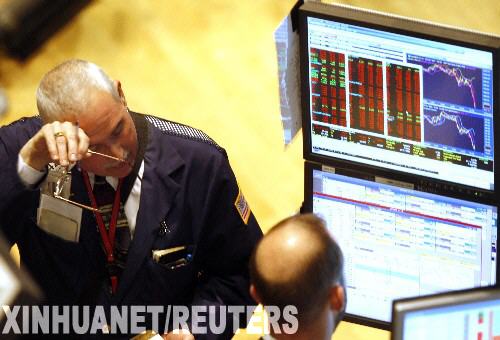 10月9日,一名交易員在美國紐約股票交易所工作時(shí)擦拭額頭。由于信貸市場依然緊縮和國際油價(jià)持續(xù)走低打壓金融和能源板塊,以及通用汽車股價(jià)跌至58年來新低,9日紐約股市再次暴跌,道瓊斯指數(shù)下跌超過650點(diǎn),收于8600點(diǎn)以下,標(biāo)普跌幅也超過7%。新華社/路透