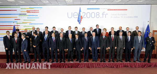 10月15日,在位于比利時(shí)布魯塞爾的歐盟總部,參加歐盟峰會(huì)的各國(guó)領(lǐng)導(dǎo)人和歐盟官員合影。為期兩天的歐盟首腦會(huì)議當(dāng)天在布魯塞爾開幕,重點(diǎn)討論歐盟如何應(yīng)對(duì)當(dāng)前愈演愈烈的金融危機(jī)。新華社/法新