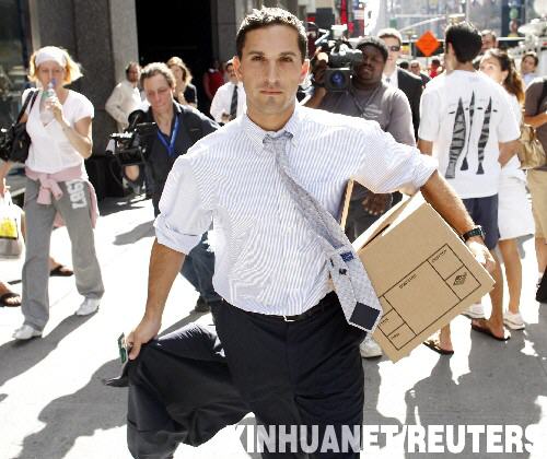 資料圖片:9月15日,在美國紐約,一名雷曼兄弟公司的雇員拿著裝有私人物品的紙箱離開公司。當(dāng)日,美國第四大證券公司雷曼兄弟申請破產(chǎn)保護(hù),意味著這家在華爾街生存了158年的老牌投資銀行將壽終正寢。新華社/路透