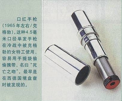 隱蔽武器的大量研制始于二戰(zhàn)。這種武器可以給間諜提供隱蔽打擊敵人的手段。有系在腰帶上或裝在袖子中的射擊武器、也可以偽裝成雪茄、煙斗或者雪茄。前蘇聯(lián)情報(bào)部1939年就研制成功專(zhuān)門(mén)用于暗殺的香煙盒型手槍?zhuān)?guó)情報(bào)部門(mén)二戰(zhàn)時(shí)還使用過(guò)“線(xiàn)軸”型手槍和煙斗手槍。二戰(zhàn)后,情報(bào)機(jī)構(gòu)繼續(xù)研制這種武器,最值得注意的是KGB配備的4.5毫米口徑射擊武器,它容易藏在許多地方包括口紅的筒桿中,一旦身份暴露就出其不意地致人于死地,然后迅速逃離現(xiàn)場(chǎng)。前KGB的唇膏手槍外形酷似一支唇膏,其實(shí)卻是一支用于近距離射擊的單發(fā)手槍?zhuān)苑Q(chēng)之為“死亡之吻”。