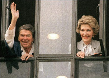 1987年1月5日,里根在接受前列腺手術(shù)后與妻子南希向公眾揮手。