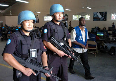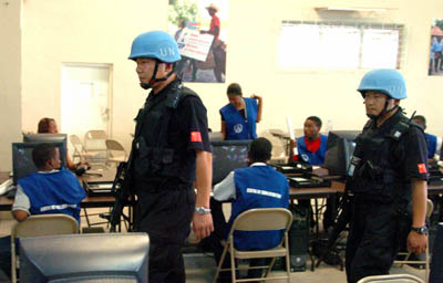 2006年2月4日,中國維和警官王雷和田雷(左)在太子港海地大選計(jì)票中心執(zhí)勤。自當(dāng)日起,我維和防暴警察開始進(jìn)入海地大選計(jì)票中心執(zhí)勤。聯(lián)合國海地穩(wěn)定特派團(tuán)警察總監(jiān)格雷厄姆4日證實(shí),中國維和警察防暴隊(duì)將在7日舉行的海地總統(tǒng)、議會(huì)和地方選舉中承擔(dān)全國計(jì)票中心的保衛(wèi)任務(wù)。