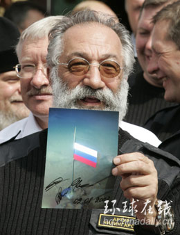 8月7日,俄羅斯國家杜馬(議會下院)副主席、知名北極專家奇林加羅夫率領北極科考隊乘飛機返回莫斯科,受到了英雄般的熱烈歡迎。圖為奇林加羅夫走下飛機時手舉一面俄羅斯國旗。俄深海潛水器2日抵達北極點的北冰洋海底,其搭載的科學家們在那里插上了一面高1米、能保存100年左右的鈦合金俄羅斯國旗。?
