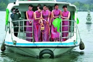 2005年3月22日,日本愛知世博會(huì)中國(杭州)形象大使在西湖打水,灌入一只仿南宋官窯瓷瓶,這瓶水將隨杭州世博會(huì)代表團(tuán)送赴愛知世博會(huì)與另一瓶采自日本長良川湖的湖水混合倒入一只魚缸并養(yǎng)上金魚,象征中日兩國人民的友誼長在李忠/圖