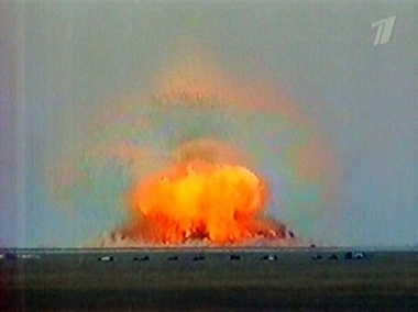 電視畫面顯示,俄羅斯一架圖-160戰(zhàn)略轟炸機(jī)在一個(gè)試驗(yàn)場上空投放了這枚炸彈,爆炸隨后發(fā)生,巨大的火球騰空而起,附近的一座大樓轟然倒塌,土地被燒焦。