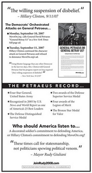 中國日報網(wǎng)環(huán)球在線消息:美國共和黨總統(tǒng)參選人朱利安尼9月14日在《紐約時報》上刊登整版廣告,批評對手、民主黨總統(tǒng)參選人希拉里·克林頓對駐伊美軍最高指揮官戴維·彼得雷烏斯的攻擊。