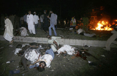 爆炸發(fā)生后,現場血跡斑斑,一片狼藉,汽車玻璃、輪胎散落一地??ɡ驷t(yī)院方面稱有136人喪生,250人受傷,而美國有線電視新聞網認為受傷的超過了387人。英國媒體援引巴基斯坦內政部官員賽義德?卡邁勒的話說,133人在爆炸中遇難,290人受傷??ㄟ~勒表示:“初步調查顯示,這是自殺性爆炸,目標就是(貝?布托)那輛車?!?/p>