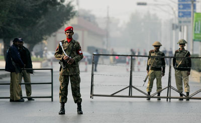 11月28日,巴基斯坦軍警守衛(wèi)在拉瓦爾品第的“陸軍曲棍球體育場(chǎng)”外。
