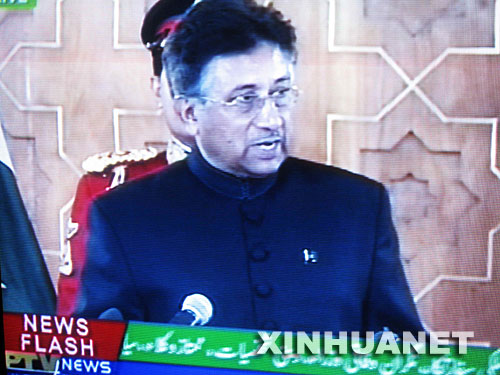 11月29日,穆沙拉夫以平民身份宣誓就任新一屆巴基斯坦總統(tǒng)。這是巴基斯坦官方電視臺播放的穆沙拉夫就職的電視照片。新華社發(fā)