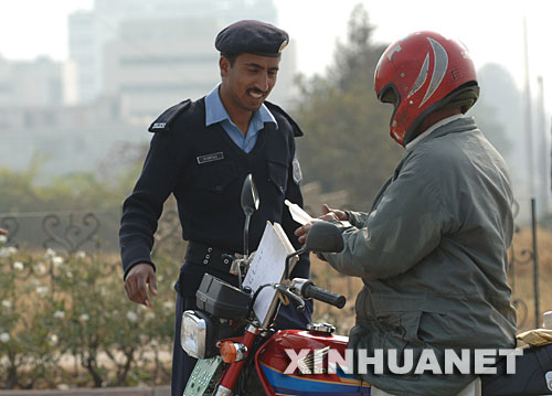 11月29日,在巴基斯坦首都伊斯蘭堡的總統(tǒng)府附近,警察檢查一名騎摩托車者的證件。當(dāng)天,剛剛辭去陸軍參謀長職務(wù)的穆沙拉夫在總統(tǒng)府以平民身份宣誓就任新一屆巴基斯坦總統(tǒng)。新華社記者李敬臣攝
