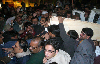 巴基斯坦拉瓦爾品第的一家醫(yī)院宣布貝·布托死亡之后,她的家人決定將其遺體送到當(dāng)?shù)剀娪脵C(jī)場(chǎng),并由此運(yùn)往其家鄉(xiāng)。當(dāng)她的遺體從醫(yī)院里被抬出來時(shí),數(shù)百名傷心欲絕的支持者簇?fù)碓诒桓吒咛鸬哪局乒啄局車?,痛哭不已?/p>