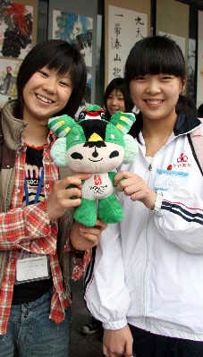 2008年3月12日,日本愛知縣高中生松野尤美子(左)對(duì)中國高中生贈(zèng)送的福娃愛不釋手。