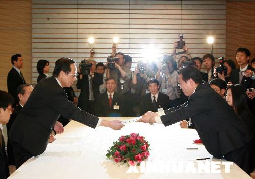 5月1日,在日本東京的首相官邸,全日本中國留學人員友好聯(lián)誼會會長李光哲(右)向日本首相福田康夫贈送留日同學會為紀念中國留學生留日110周年編寫的《留日百年巡禮》。在中國國家主席胡錦濤即將訪日之際,福田當天下午在首相官邸接見了10名中國留學生代表。福田表示,希望日中兩國年輕人共同努力,為日中友好做出貢獻。新華社記者任正來攝