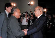 1978年10月23日,《中日和平友好條約批準(zhǔn)書(shū)》互換儀式在日本首相官邸舉行。鄧小平副總理與日本首相福田赳夫出席互換儀式,中國(guó)外交部部長(zhǎng)黃華和日本外相園田直分別代表本國(guó)在批準(zhǔn)書(shū)上簽字?!吨腥蘸推接押脳l約》從此生效。鄧小平副總理和福田赳夫首相在互換儀式上發(fā)表了談話。