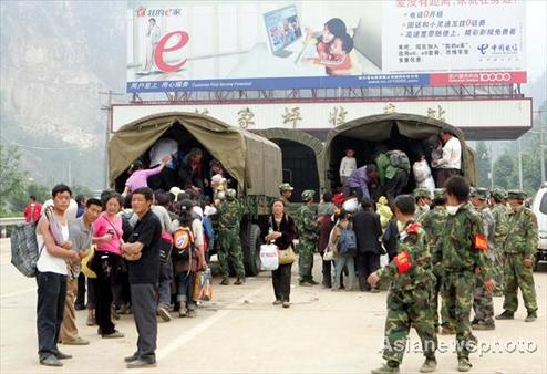 截至18時(shí),仍有數(shù)百災(zāi)民滯留在當(dāng)?shù)?。?jù)悉,當(dāng)日18時(shí)前后,北川發(fā)生了3次較強(qiáng)余震。圖為:災(zāi)民排隊(duì)等待撤離[攝影:中國(guó)日?qǐng)?bào) 徐京星]