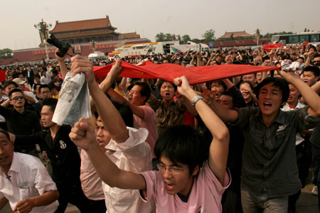 19日14:28分開始的三分鐘默哀結(jié)束后,聚集在北京天安門廣場的人群沒有走,他們?nèi)匀痪奂趶V場上,手持國旗和菊花,高喊:“加油四川!加油中國!”[中國日報 姜東攝影]