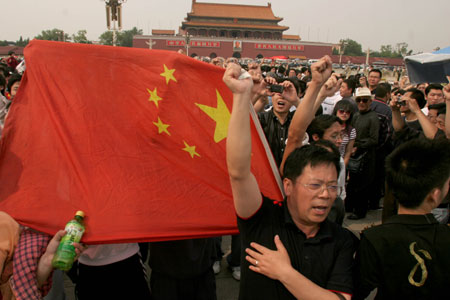 19日14:28分開始的三分鐘默哀結(jié)束后,聚集在北京天安門廣場的人群沒有走,他們?nèi)匀痪奂趶V場上,手持國旗和菊花,高喊:“加油四川!加油中國!”[中國日報 姜東攝影 ]