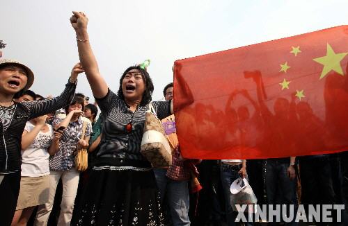 5月19日,北京天安門(mén)廣場(chǎng)的群眾在默哀后齊聲高呼“中國(guó)加油!”“汶川加油!”。 2008年5月19日至21日為全國(guó)哀悼日。5月19日14時(shí)28分起,全國(guó)人民默哀3分鐘,汽車(chē)、火車(chē)、輪船鳴笛,防空警報(bào)鳴響。新華社記者薛東梅攝’