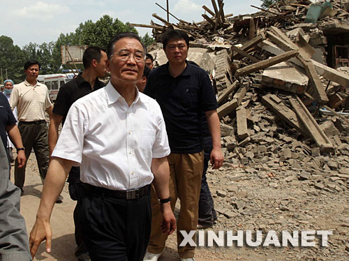 5月15日,中共中央政治局常委、國務院總理溫家寶輾轉趕到位于四川北部的青川縣木魚鎮(zhèn)看望受災群眾。這是溫家寶在木魚鎮(zhèn)文武村的臨時安置點看望災民。新華社記者姚大偉 攝