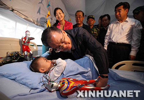 5月23日,中共中央政治局常委、國務(wù)院總理、國務(wù)院抗震救災(zāi)總指揮部總指揮溫家寶前往四川綿陽404醫(yī)院看望受傷群眾。這是溫家寶在監(jiān)護(hù)室看望在地震中受傷的小朋友郎錚。新華社記者姚大偉攝