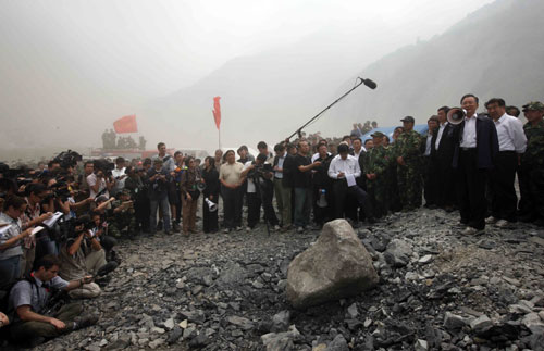 5月24日,中共中央政治局常委、國務(wù)院總理、國務(wù)院抗震救災(zāi)總指揮部總指揮溫家寶重返四川地震震中汶川縣映秀鎮(zhèn)時(shí)接受中外記者的聯(lián)合采訪。[新華社圖片]