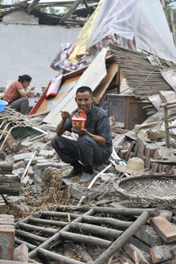 5月24日,剛返回北川縣擂鼓鎮(zhèn)的受災群眾在自家倒塌的房屋前吃午飯。日前,眾多四川北川縣的受災群眾陸續(xù)返回家鄉(xiāng)。面對地震后的斷壁殘垣,災區(qū)群眾積極樂觀,以堅強的心態(tài)重建家園。