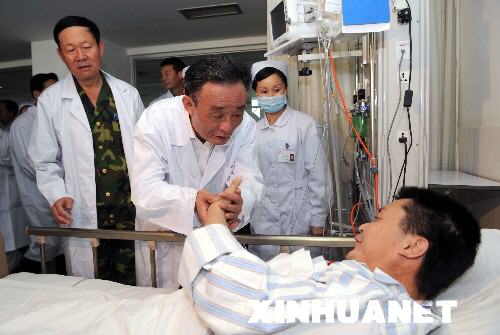 這家醫(yī)院的重癥病房,收治了幾位被廢墟掩埋100多個小時的重傷員。在病床前,吳邦國詳細(xì)詢問他們的傷勢和救治情況。他們握著委員長的手激動地說,是黨和人民給了我們第二次生命,我們從內(nèi)心無比感激,一定好好地活下去,將來為社會作貢獻(xiàn)。吳邦國俯下身來對他們說,你們很堅強,創(chuàng)造了生命的奇跡,全國人民都很關(guān)心你們,希望你們早日康復(fù),相信只要我們共同努力,就沒有過不去的坎。他反復(fù)叮囑在場的醫(yī)務(wù)人員,這些重傷員創(chuàng)造了生命的奇跡,我們一定要盡全力救治傷員,創(chuàng)造醫(yī)療史上的奇跡。在離開醫(yī)院前,吳邦國與醫(yī)務(wù)人員親切握手。他說,你們急傷員之所急,夜以繼日地連續(xù)工作了半個月,非常辛苦,非常疲勞。正是在你們的全力救治下,很多危重傷員脫離了生命危險,不少受傷群眾康復(fù)出院。災(zāi)區(qū)人民不會忘記你們,全國人民感謝你們。