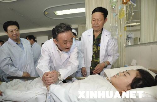5月26日,中共中央政治局常委、全國人大常委會委員長吳邦國專程赴四川地震災(zāi)區(qū),慰問干部群眾,看望救援人員,指導(dǎo)抗震救災(zāi)工作。這是吳邦國委員長在成都軍區(qū)總醫(yī)院看望在汶川地震104個小時后獲救的20歲少女袁藝。新華社記者黃敬文攝