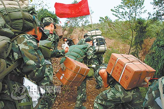 5月26日,武警水電部隊組織431名突擊隊員,身背雷管炸藥,徒步翻山越嶺,奔赴唐家山堰塞湖執(zhí)行搶險任務(wù)。記者岱天榮攝