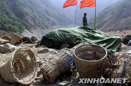 5月27日,一名武警戰(zhàn)士守衛(wèi)堆放在北川唐家山堰塞湖堰塞體上的工程炸藥。這些炸藥都是戰(zhàn)士們用背簍徒步背到搶險現(xiàn)場的。新華社記者黎大東 攝