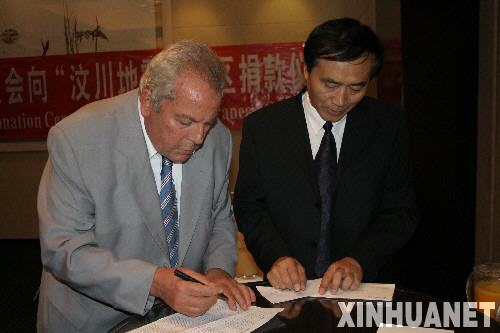 5月30日,在希臘雅典召開的中國船級社地中海委員會2008年年會上,希臘船東卡內(nèi)西斯(左)為地震災(zāi)區(qū)捐款。當(dāng)晚希臘船東為地震災(zāi)區(qū)捐款總數(shù)達(dá)到21.5萬美元。新華社記者梁業(yè)倩攝
