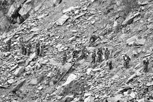 地面:6月4日,成都軍區(qū)某集團軍官兵冒著泥石流隨時可能發(fā)生的危險,繼續(xù)搜救失事直升機。孫繼煉攝