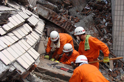 山東省濰坊市公安消防支隊(duì)隊(duì)員在四川災(zāi)區(qū)現(xiàn)場(chǎng)搜救