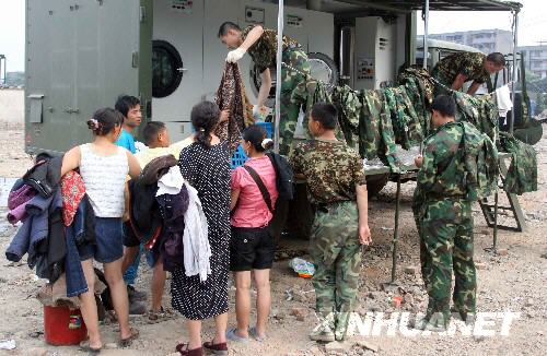 部隊(duì)官兵用野戰(zhàn)洗滌車為受災(zāi)群眾免費(fèi)洗衣物(6月5日攝)。 新華社記者 張燕輝 攝