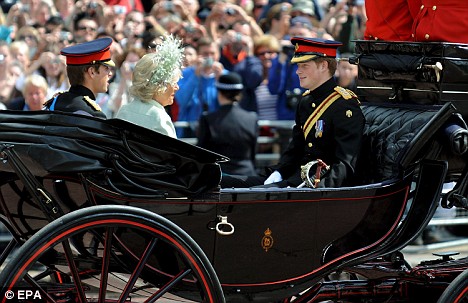 據(jù)英國(guó)《每日郵報(bào)》6月14日?qǐng)?bào)道,女王當(dāng)天身著藍(lán)綠色外套,頭戴同色調(diào)的帽子,與身穿紅色束身軍裝、頭戴傳統(tǒng)熊皮帽子的菲利普親王共乘一輛制造于1842年的敞篷馬車。查爾斯王子、安妮公主率馬隊(duì)緊隨其后。身著軍裝的威廉王子、哈里王子則與康沃爾公爵夫人(即查爾斯王子夫人)卡米拉共同乘座一輛馬車在后相隨。