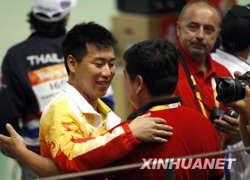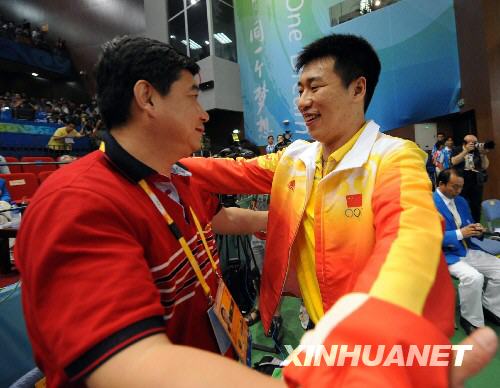 8月9日,中國(guó)選手龐偉(右)和教練王義夫慶祝勝利。