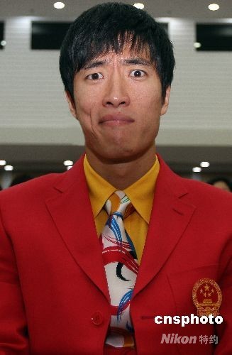 7月25日,參加北京奧運(yùn)會的中國體育代表團(tuán)在北京正式成立,長期封閉訓(xùn)練難得露面的劉翔穿上代表團(tuán)的全套正裝神態(tài)輕松,不改頑皮活潑的本性。中新社發(fā) 任晨鳴 攝
