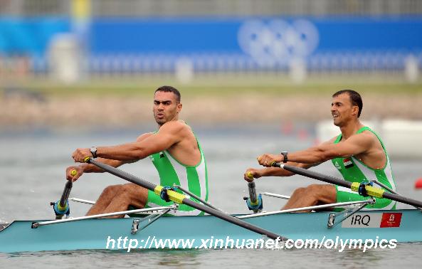 8月11日,伊拉克選手海德爾·努扎德/侯賽因·杰布爾(左)在男子雙人雙槳復(fù)賽中。他們以6分52秒71的成績(jī)獲得小組第五。新華社記者姜恩宇攝